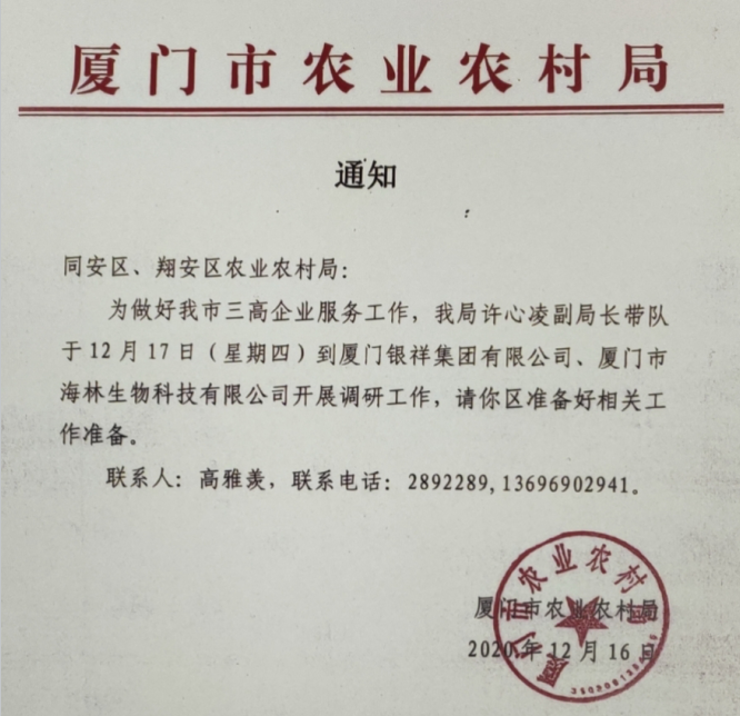 廈門(mén)市農(nóng)業(yè)農(nóng)村局蒞臨廈門(mén)市海林生物科技有限公司開(kāi)展三高企業(yè)服務(wù)調(diào)研工作